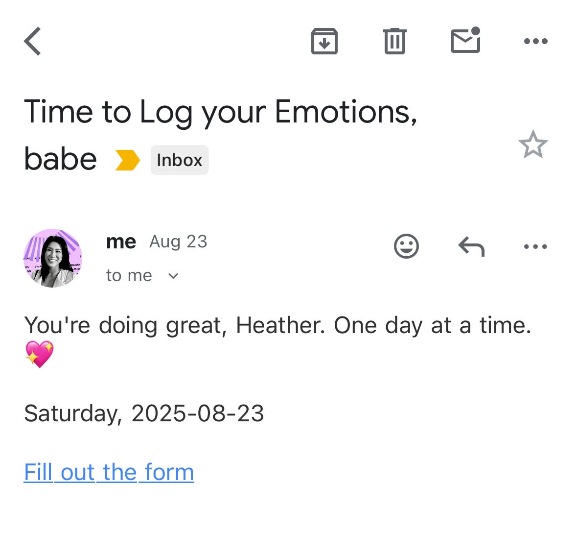 I used Apps Script to automate a nightly survey email arriving between 9-10 PM with a prefilled date, asking me to rate four emotions on a 0-5 intensity scale.